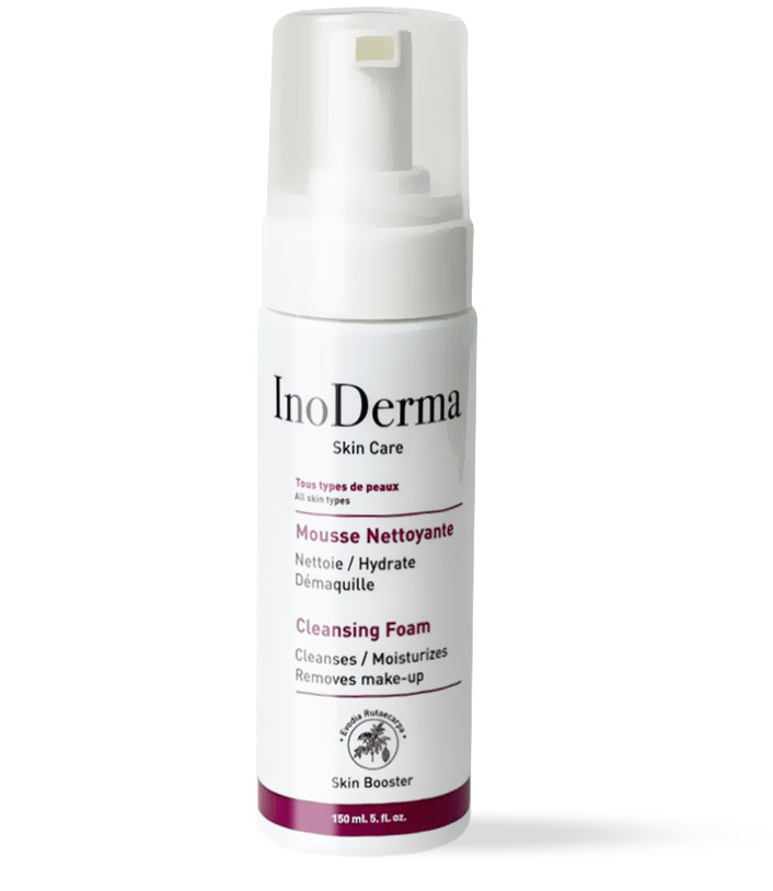 InoDerma Mousse Nettoyante, démaquille et nettoie en douceur visage, yeux et lèvres. Elle hydrate, apaise et illumine le teint avec un effet bonne mine grâce aux vertus extraits de l’extrait du fruit d’Evodia Rutaecarpa et de fleur de Camomille.